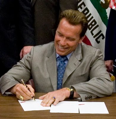 Check this out - Arnold Schwarzenegger, the King of the Land of Fruits & Nuts (insert his odd pronunciation of the state's name here...), is ready, willing and able to sign the California Bag Ban bill, AB 1998 (fact sheets here), as soon as it gets through the senate (it has already passed the Assembly). Check this bold, concise, and bulgingly-muscular statement from Der Governator: