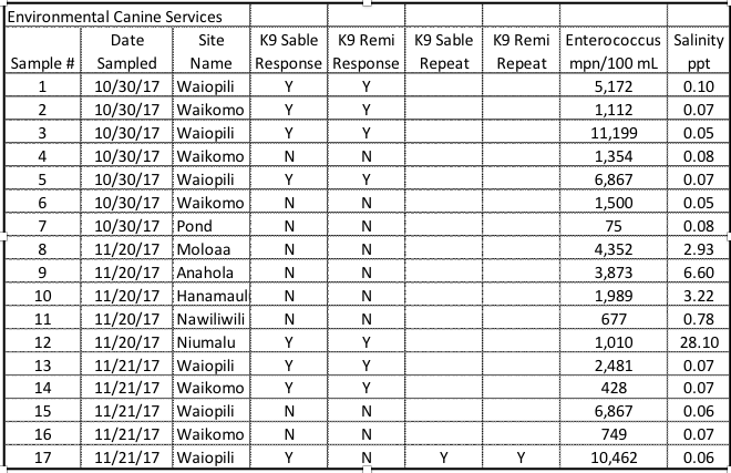 Seventeen samples were collected, tested for Enterococcus bacteria, and analysed for salinity. They were then canine scent tested. All samples had extremely high concentrations of Enterococcus and except for Puali tidal estuary, had very low salinity (Table 1).