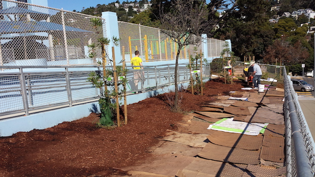 In the fall, a group of about 30 volunteers came out to sheet much the weeded area, which was characterized by highly compressed dirt. The sheet mulching project combined with winter rains allowed the soil to break up and rehabilitate, increasing its permeability and ability to retain water and support vegetative life. Workday 2 - Early this year came phase two of the project: installation of a bio-swale. A swale is a low point to which water flows and can be thought of as a dry creekbed; add plants for the “bio” part. Again, a dedicated group of over 30 students, parents, and volunteers came out to install the bio-swale. The bios-wale now extends the entire 100 ft length of the project site, and is able to catch and retain surface water runoff coming from the west side of campus (containing impermeable playground and lunch areas).