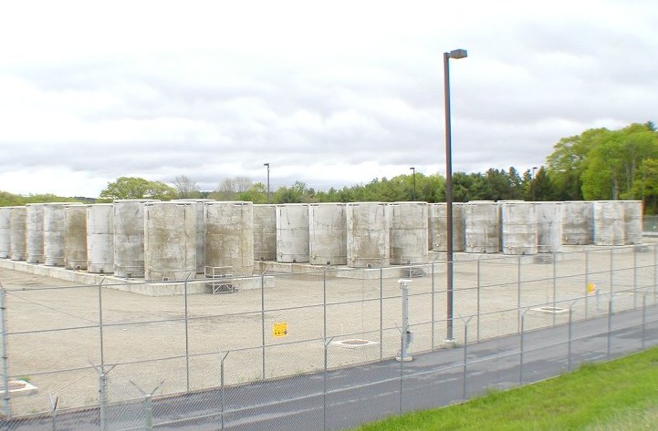 Outdoor self standing thin-cask dry storage “facility” at Maine Yankee, with thin-walled casks surrounded in concrete. (Photo by Maine Yankee Nuclear Power Plant)