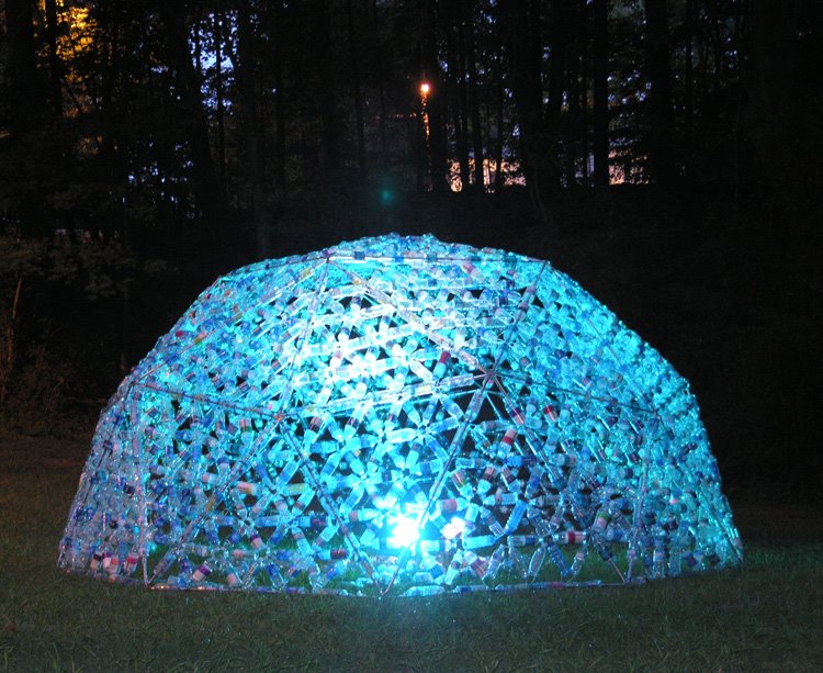 06.24.08 2,500 bottles makes you… By Surfrider Foundation I’ve blogged on Pam Longobardi before, this time around she takes to the bottle… and makes a gorgeous dome out of… old, discarded water bottles.Check out her bottle site.