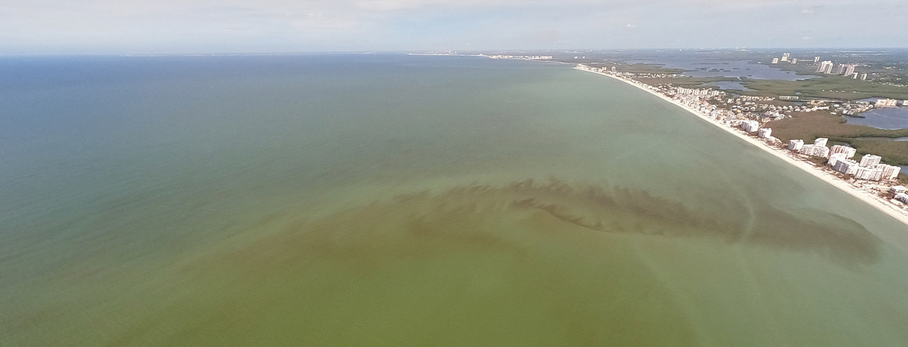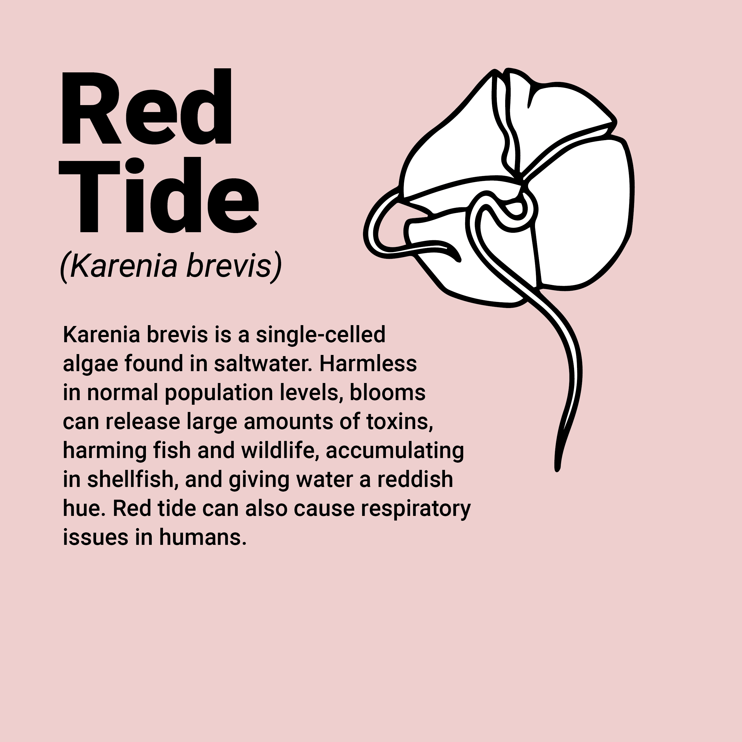 Red tide is a type of Harmful Algal Bloom (HAB). HABs are generally defined as the overgrowth of algae in salt or freshwater and can produce dangerous toxins for humans and animals at certain levels. Karenia brevis is not new to the region and has actually been well-documented along Florida’s Gulf Coast since the 1840s. At normal population levels, Karenia brevis can be harmless. When fueled by excess nutrient pollution from anthropogenic sources, however, these algae can proliferate to the point of toxicity for humans and animals, leaving beaches and waterways unfit for recreational use. Simply breathing in the pungent odor of the red tide toxins can trigger immediate coughing, sneezing, and teary eyes, contact with water can cause skin irritation, and these symptoms can lead to serious illness for anyone with pre-existing conditions.