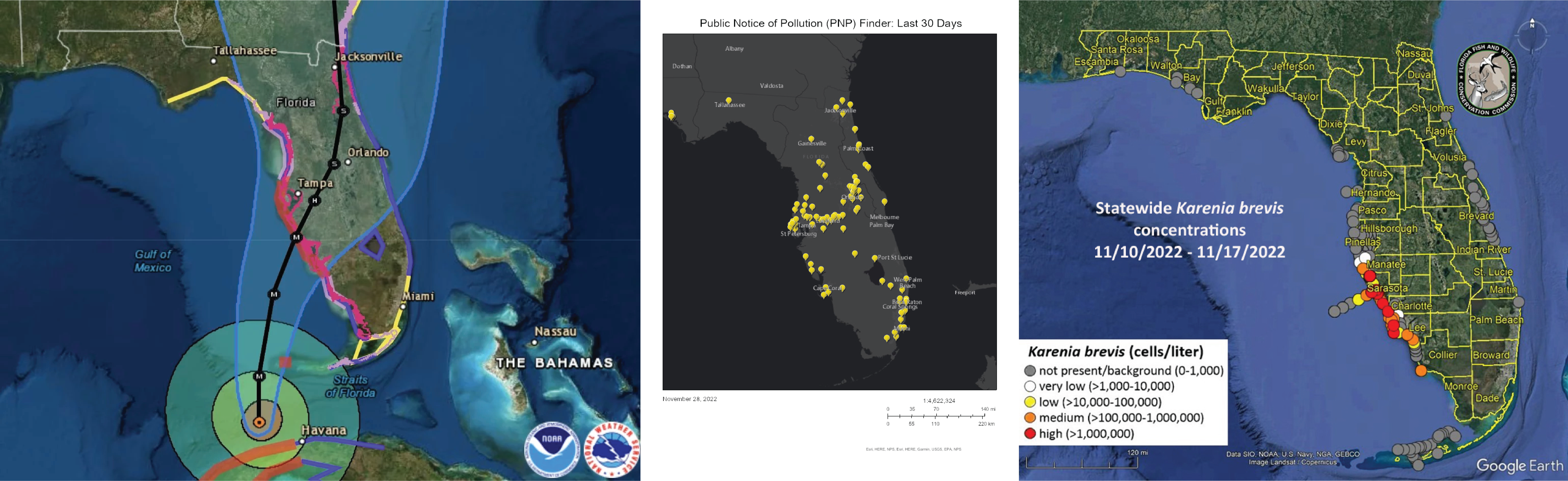 The above maps show the overlapping impact of Hurricane Ian's path, sewage spills reported to the FL Department of Environmental Protection, and the current algae blooms documented by Fish and Wildlife Conservation Commission.