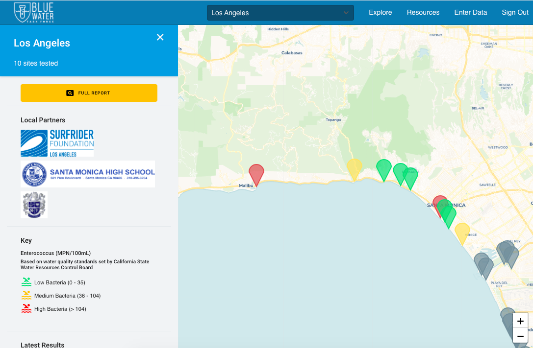 My favorite Surfrider experience—although they're all my favorite in their own ways—is definitely when my chapter's Blue Water Task Force map lit up fully for the first time after our first full capacity sampling event just recently. It was insanely rewarding to see all of my team's hard work pay off!