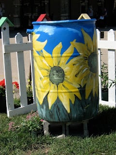 glazed ceramic pottery, and hand painted recycled metal oil barrels are just a few ideas that are not only useful but make great focal points in the garden. Drill a few holes, add a spigot and a leaf screen and you can turn any of these containers into a working rain barrel.