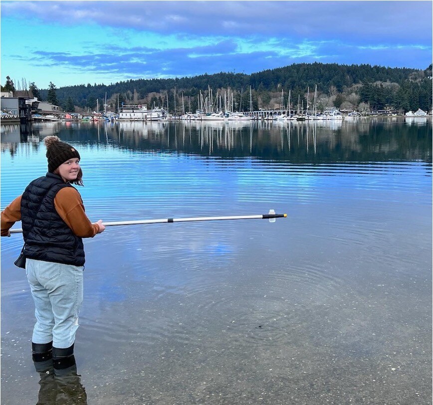 A South Sound BWTF volunteer collects a water sample in Puget Sound in Washington