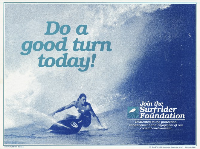ST: Glenn asked me to lend my voice to Surfrider to help bring in more members and give the organization a voice in the professional surfing community and ultimately in the wider surfer community. He said, “We want to do a poster with you on it.” It was ‘Do a Good Turn,’ and there was a picture of me doing big bottom turn at Pipeline. It was a very cool line with the double-entendre of doing a turn and then doing something good for the ocean. It’s so easy to go out there and just take the waves and not really give anything back.