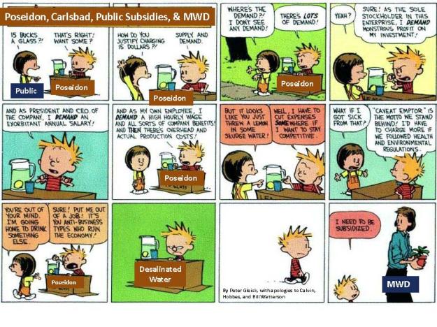“Water Number: $350 million in public subsidies to a private group. Earlier this week, one of the subsidies demanded by Poseidon was granted. The Metropolitan Water Board approved a subsidy of up to $250 per acre foot per year for 25 years, which will make MWD customers pay more for water than they would otherwise have paid, with the profits going to a private company. Up to $350 million over 25 years.