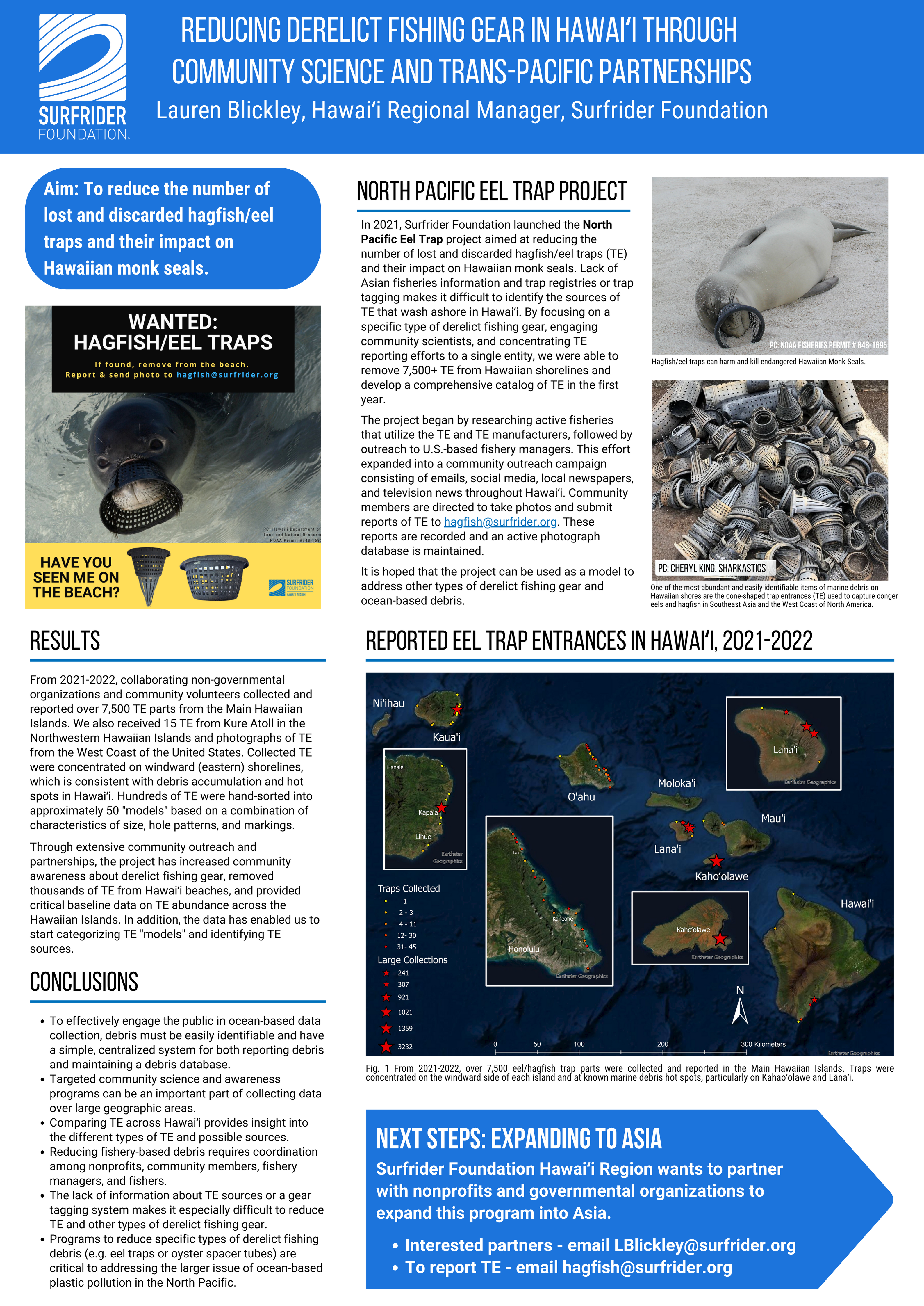A community outreach campaign, consisting of emails, social media, local newspapers, and television news was published throughout Hawaii and distributed to Surfrider Foundation volunteers, fishery managers, and nonprofit organizations along the West Coast of North America. Volunteers are directed to take photos and submit reports of TE to hagfish@surfrider.org. These reports are then recorded in a spreadsheet and a photograph database is maintained. We intend to use the 7th IMDC to expand outreach out to partners throughout the North Pacific region.
