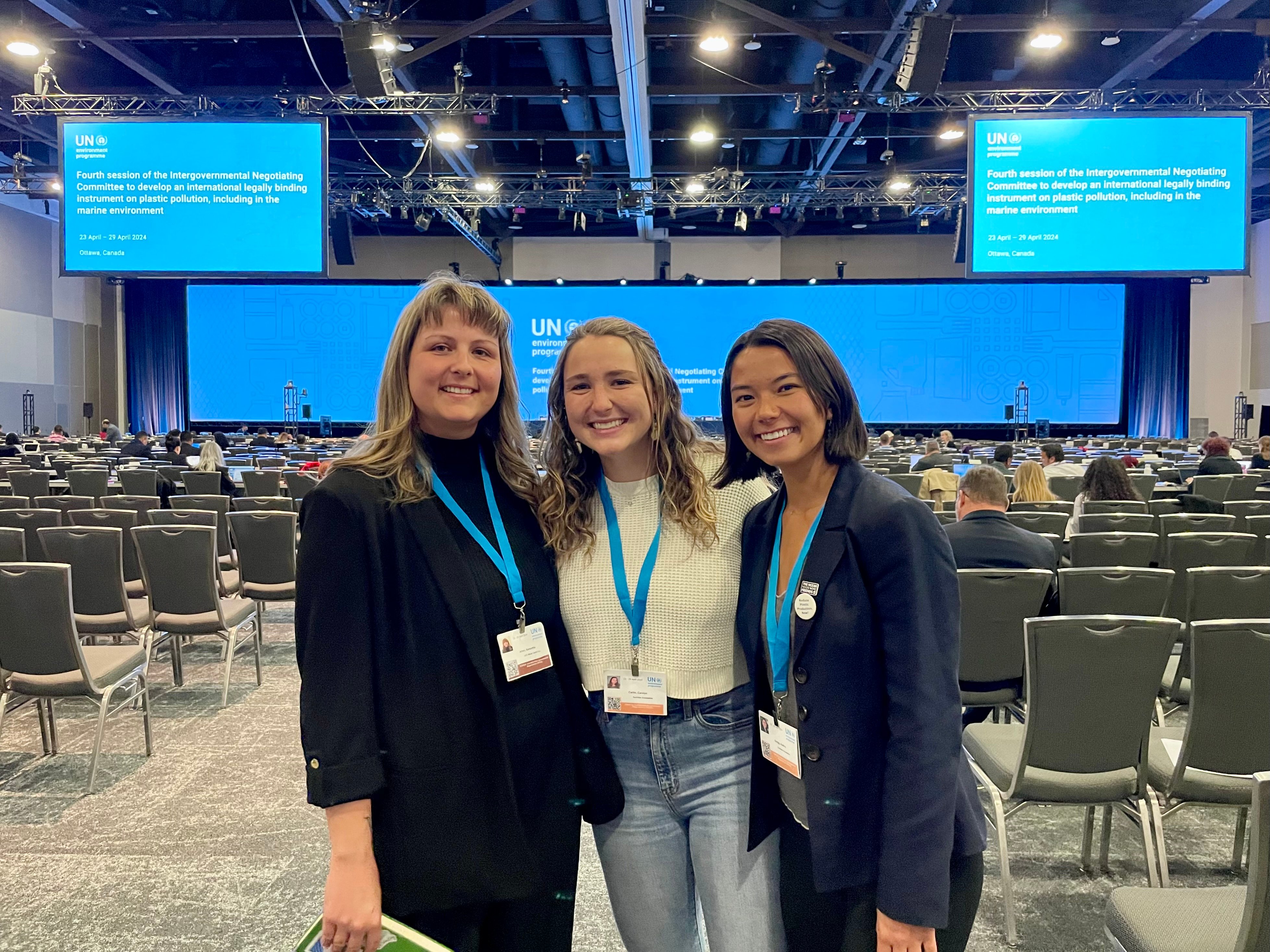 Cape Fear Vice Chair Sam Athey, Surfrider Club Network Coordinator Carolyn Curtin and Cal Poly SLO Sustainability Coordinator Audrey Gregg in Ottawa for the UN Global Plastics Treaty negotiations