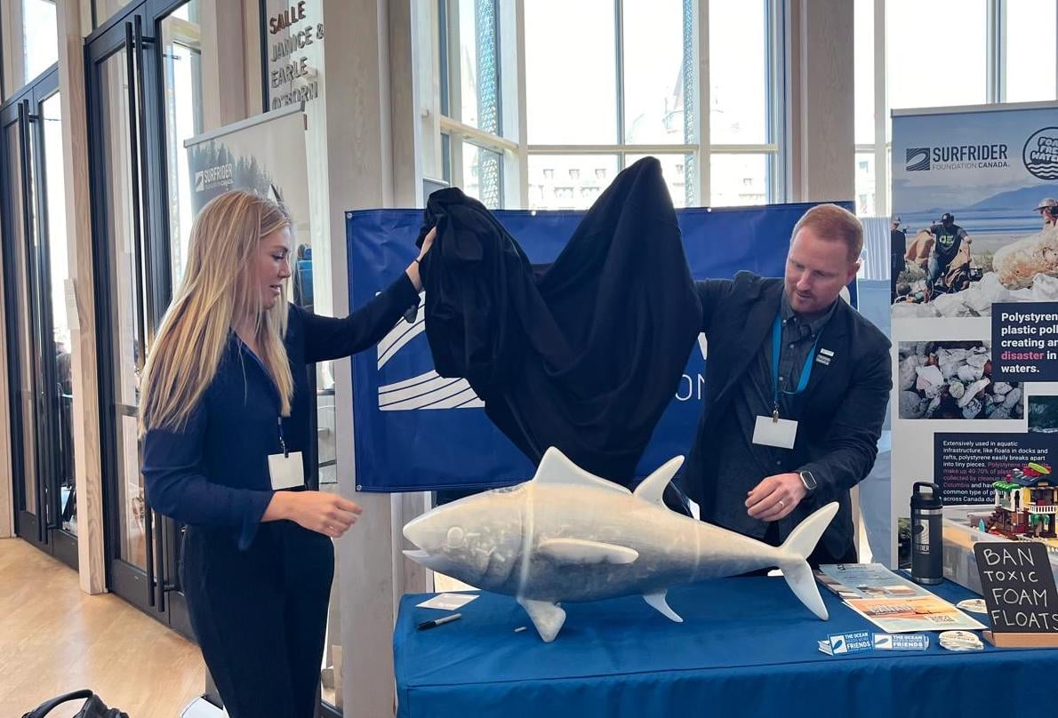 Surfrider Foundation Canada was one of only a few environmental nonprofit organizations to secure a booth in the PAZ, tribute to our global affiliate’s resounding success with campaigns in British Columbia and beyond. The booth features an innovative visual demonstration of how foam-filled docks pollute the marine environment, plus a “Smoked Tuna” display consisting of a 3D-printed tuna filled with cigarette butts collected from the heavily littered streets of Ottawa – and, yes, that is as cool and disgusting as it sounds! Surfrider Canada and partners unveiled the Smoked Tuna during a media conference on Wednesday as part of their global Hold Onto Your Butts efforts, and will continue to fill it throughout the week, a sadly simple, if gross, task.