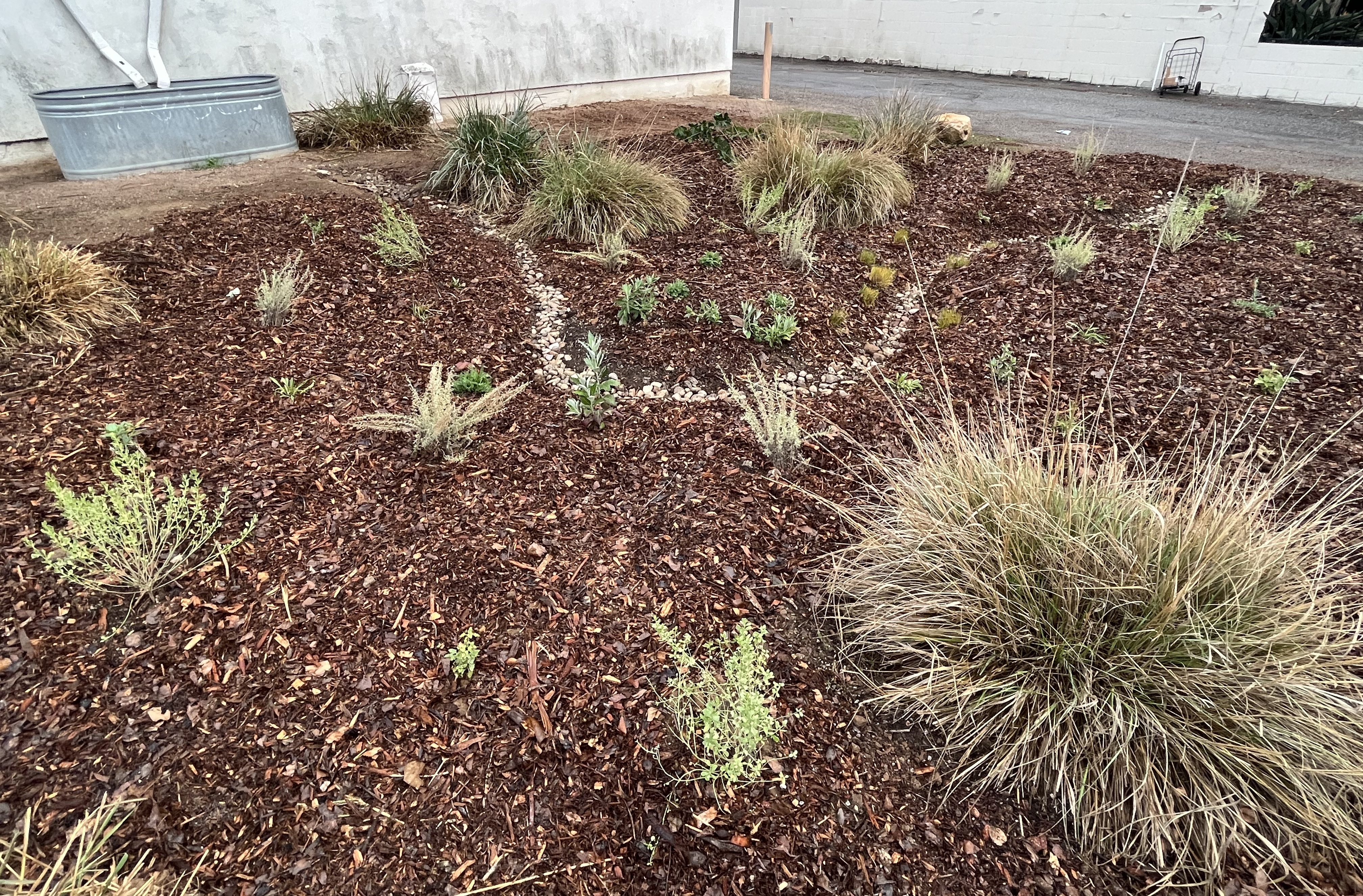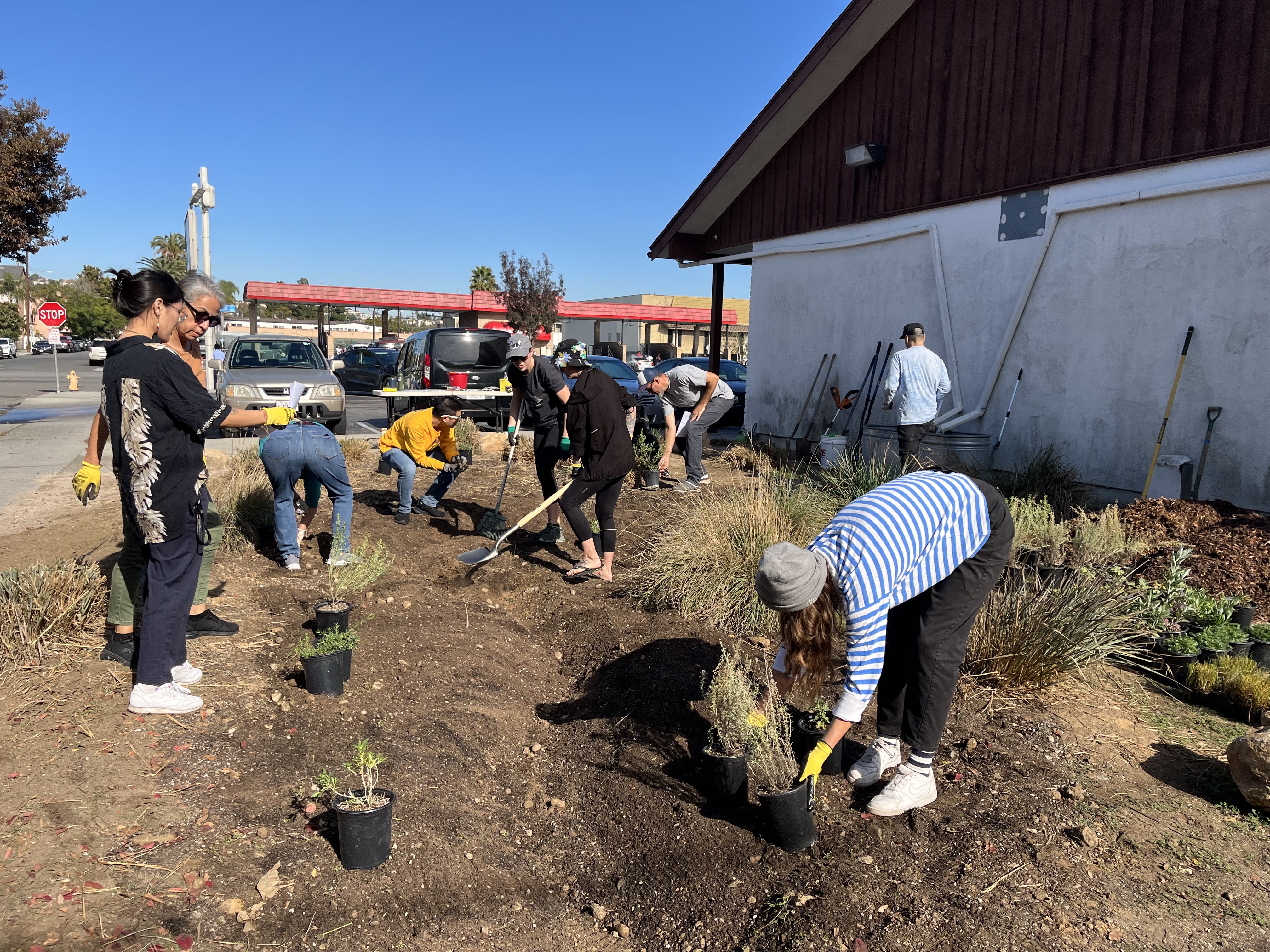 Our first demonstration project was at a vacant yard next to a convenience store. The gutters on the building were previously draining into a planter that overflowed into the yard, but many of the original plants did not survive, and the area was overdue for an update. We had an amazing crew of volunteers that transformed the yard in just a few hours, and learned a lot about Ocean Friendly Gardening. We dug out the basin of the rain garden to capture more runoff and direct more water to the plants, and created a small dry creek to guide the flow of rain. We added lots of native plants and wildflower seeds, and topped everything off with a layer of water conserving mulch. With all of the rain falling over the winter months helping to establish the plants, the garden is well on its way to providing cheerful green space to the community, pollinator habitat, and runoff prevention.