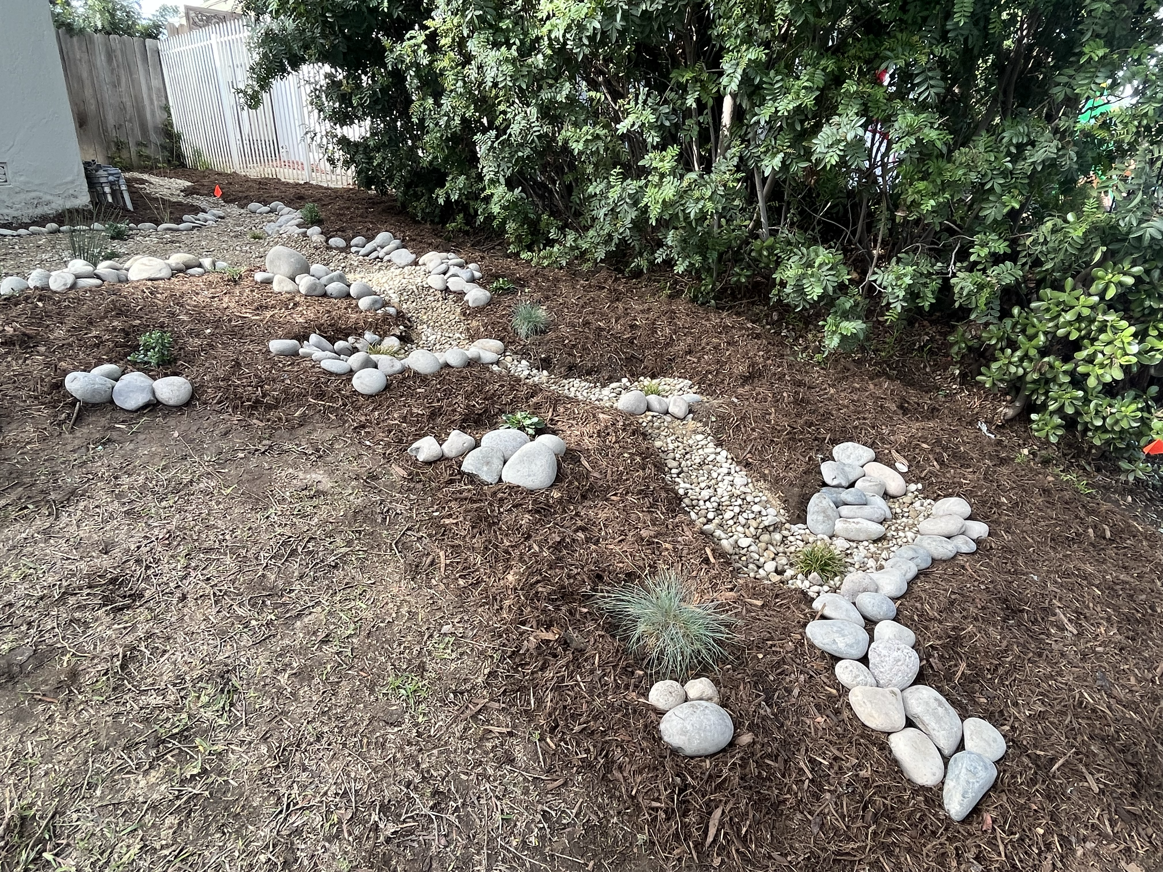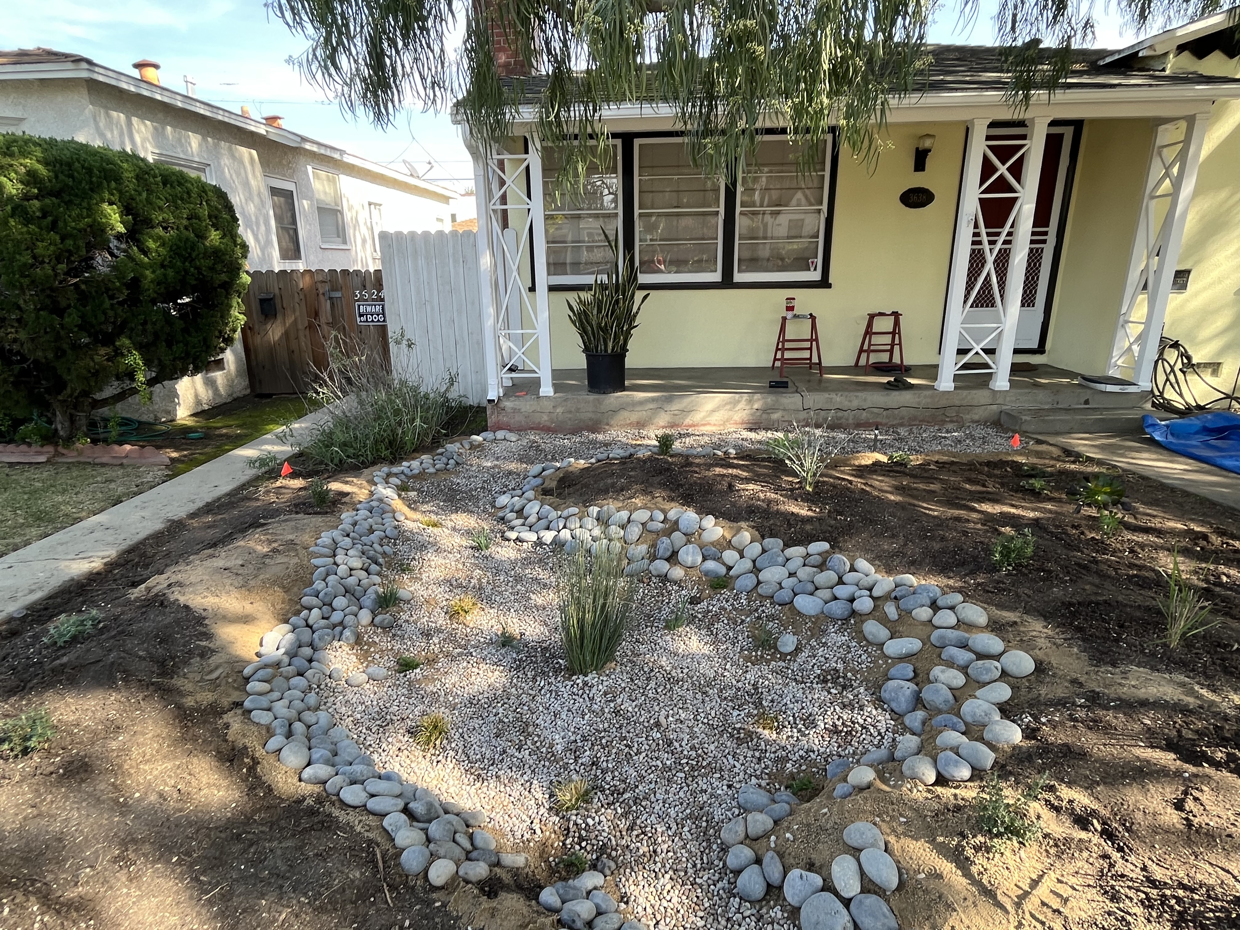 The next project we tackled was to transform a front yard in California Heights. The historic home had some issues with drainage in the backyard, and the pipe that drained into the front yard was spilling polluted runoff onto the sidewalk. The sloped yard used to have a traditional grass lawn, but to save water the homeowner had let the grass die back. Our volunteer team added a rain garden to the top of the yard and incorporated a dry creek onto the side with the drain pipe. We also planted low growing native buckwheats and manzanita to the edge of the slope to help prevent erosion and provide a transition between the rain garden and the remaining grassy areas.