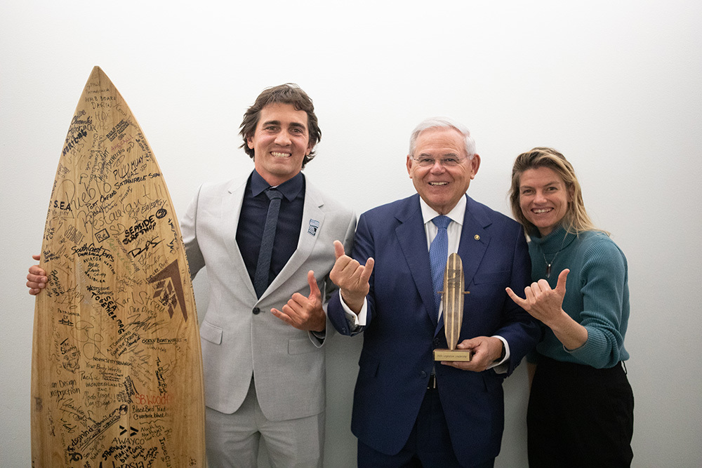 Surf Ambassadors Greg Long and Leah Dawson share the stoke with Senator Bob Menendez