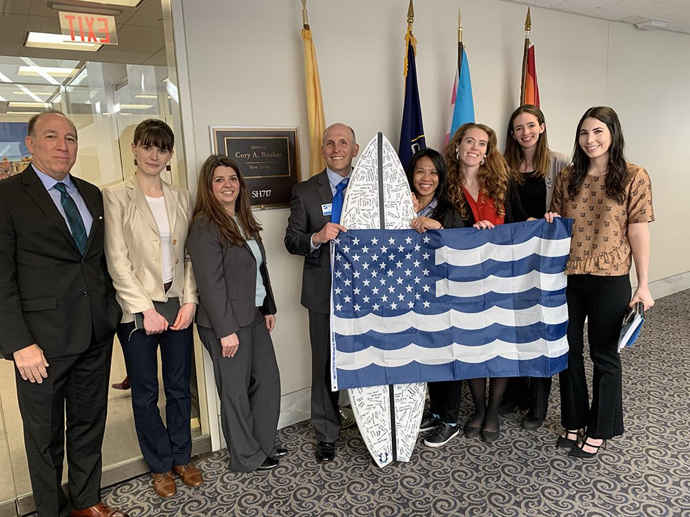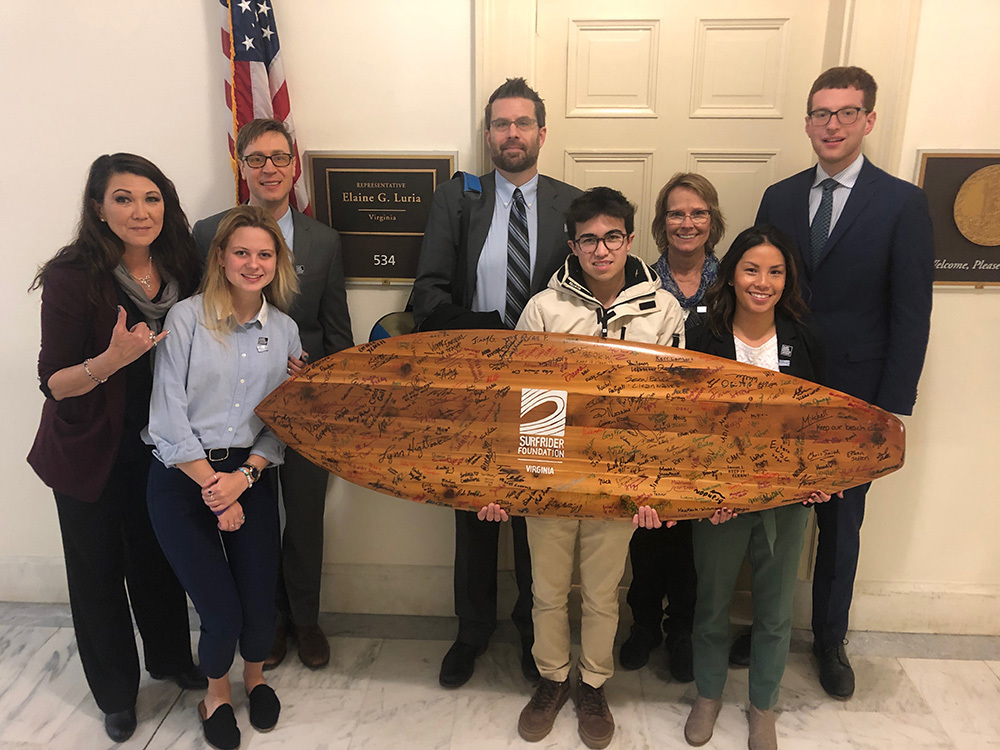 A major priority of Hill Day was demanding federal action to address the climate crisis that is damaging our coasts and ocean. Hill Day participants urged their representatives in Congress to support legislation to reduce greenhouse gas emissions, stop new oil and gas drilling, and help communities adapt to sea level rise and extreme weather events. During meetings, Surfrider presented federal leaders with surfboards and letters signed by thousands of citizens and businesses asking for immediate action on climate change.
