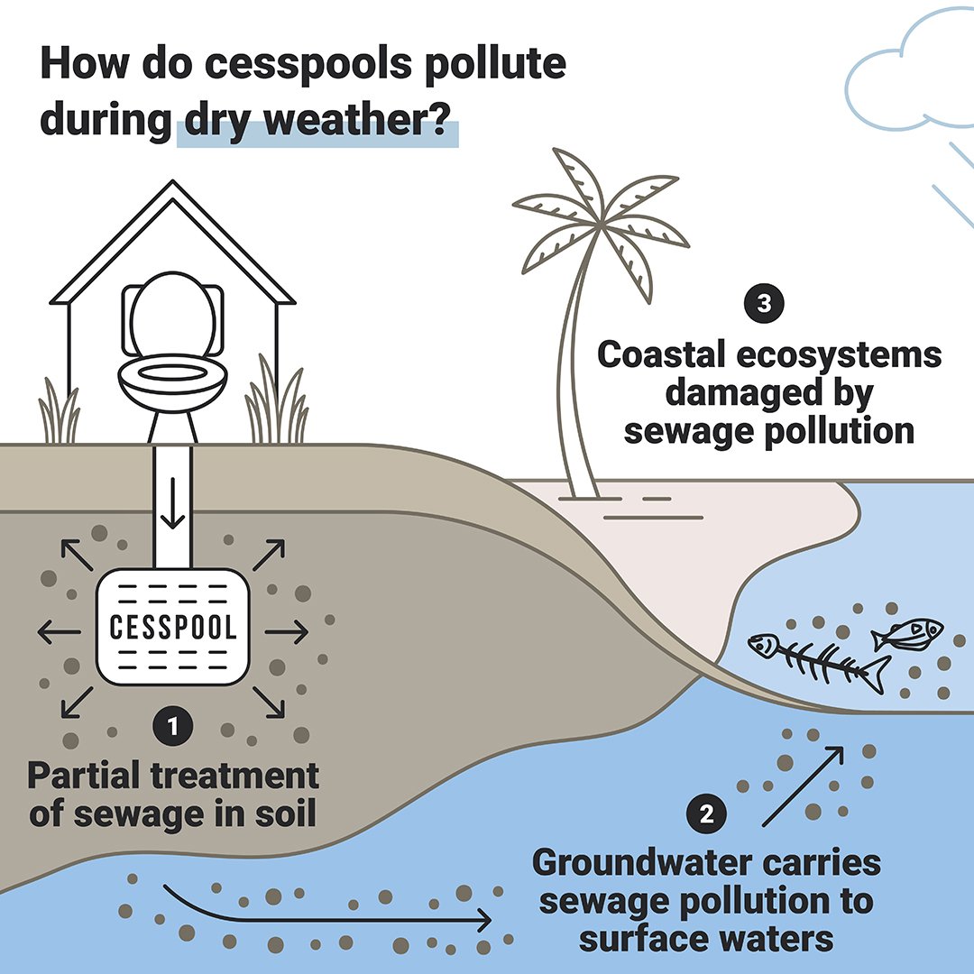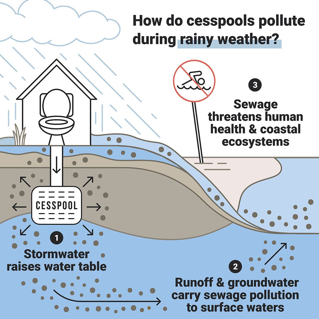 During wet weather that causes local flooding to occur, cesspools can even discharge sewage pathogens harmful to human health into our recreational waters. Flooded conditions can raise the water table so that there is no dry soil between the cess pool and groundwater and thus no filtering of pathogens. Under these conditions, cesspool effluent containing pathogens and nutrients is directed straight into surface waters via groundwater. If runoff at the surface is significant enough to saturate the top layers of the soil, cesspools can also leach out directly into stormwater runoff and end up in surface waters even quicker. It is during these wet conditions that cesspools not only pollute coastal waters with nutrients that disrupt ecosystem balance but these systems also put human health at risk by discharging sewage pathogens in recreational waters as well.