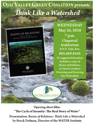 It was a real treat to have Brock Dolman visit the Ojai valley from the Occidental Arts and Ecology Center in Sonoma County. Brock delivers a unique message; as we enter the era of ‘global weirding’ on this planet ‘water,’ our watershed is our lifeboat. It is essential that we get our Basins of Relations in order…