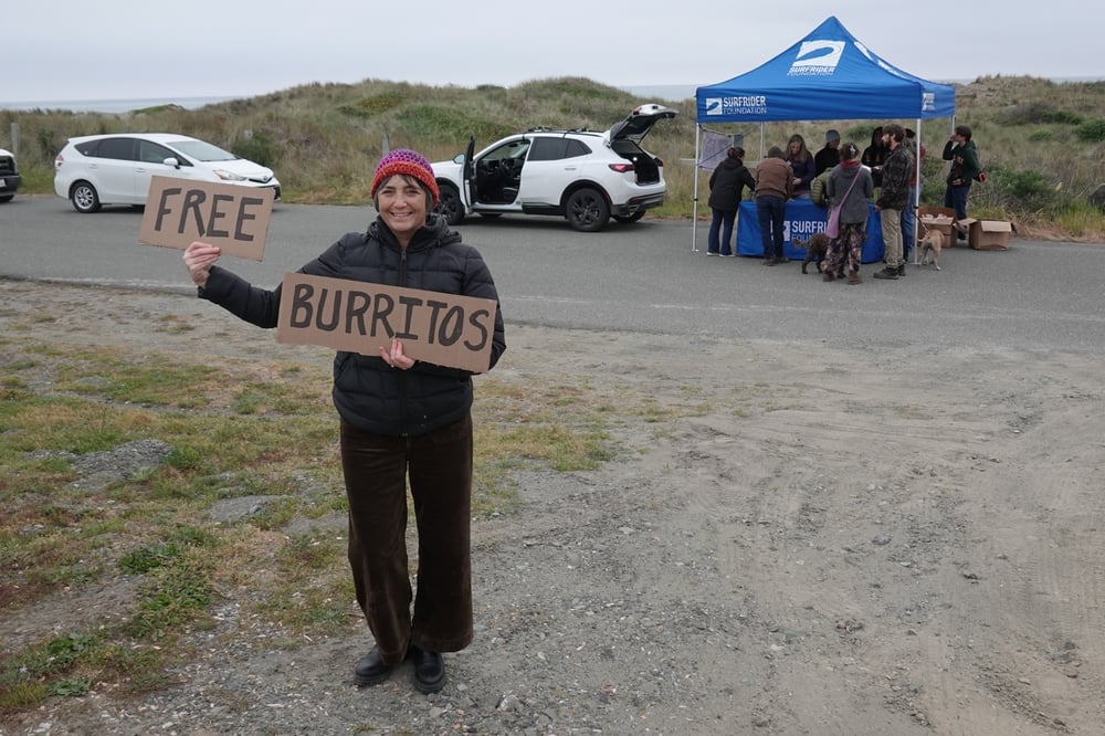 As the sun descended, so too did the temperature as the clouds rolled over Samoa Beach, just across from Humboldt Bay. Despite the windchill, we had a great turnout, with many Eureka and Arcata residents arriving to show their support for coastal access. As a thank you, we provided warm veggie burritos to keep everyone nourished during this fight to preserve our rights.