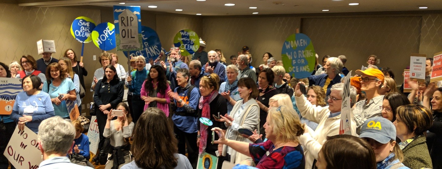 In spite of the massive confusion, lack of adequate meeting promotion or proper public communication from government officials, our coordinated campaign was still able to turn out over 250 people, who gathered in protest in Boston on Tuesday, February 27, at the start of the Bureau of Ocean Energy Management's public meeting covering the Trump Administration's Draft Proposed 2019-2024 OCS Oil and Gas Leasing Program. Opponents to offshore drilling and seismic poured out of our meeting room and down the halls, which were peppered with colorful signs, people from every walk of life adorned in ocean recreation gear and costumes, and a 15' inflatable whale, helping make the connection to the future it is clear that Massachusetts residents want to see for the coast.