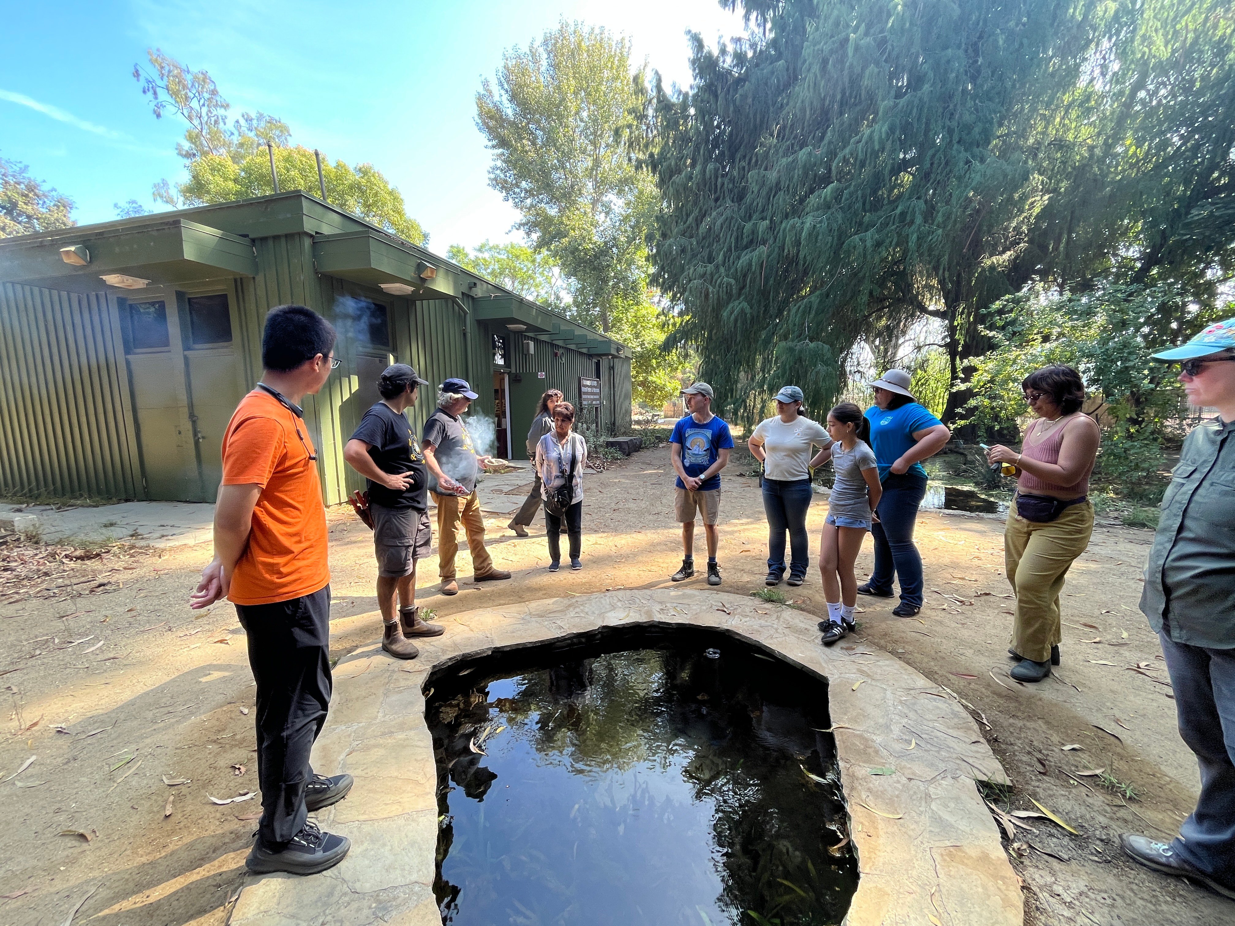Surfrider LA volunteers gather around the outlet of the bubbling spring to learn about the history from Tongva community member Bob Ramirez & Angie Behrns, Tongva elder
