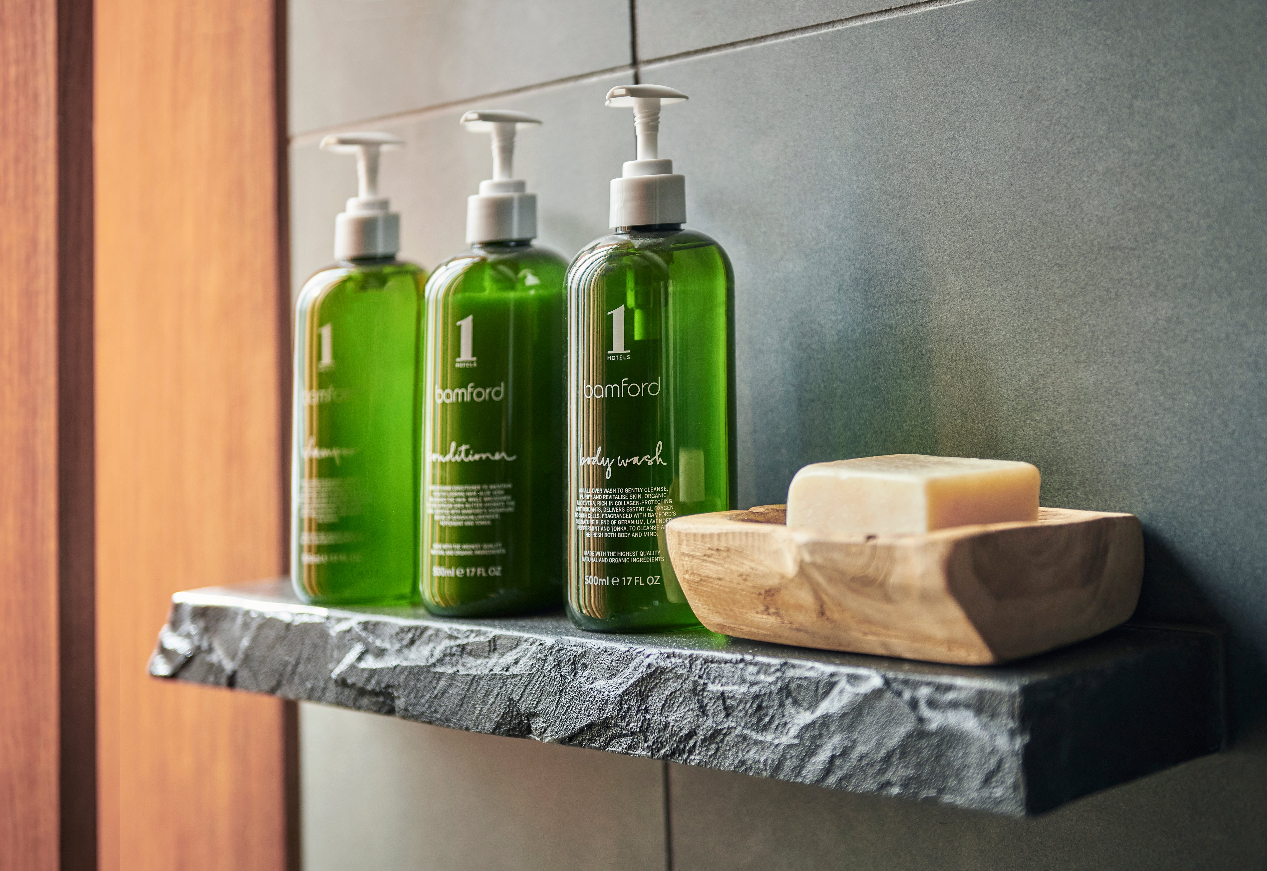 Instead of mini plastic toiletry bottles, they use large form bottles! Images provided by 1 Hotel Hanalei Bay.