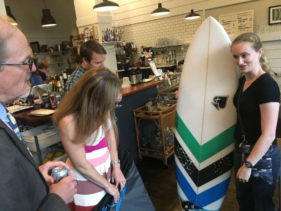 We signed up to be the [first in Massachusetts] Surfrider Ocean Friendly Restaurant because Surfrider asked us to! Ha. It's kind of a funny story. I thought it was a mistake at first, like someone thought we were a restaurant in California or something. Nothing about surfing, or surfing adjacent, had ever been on our business radar before. We worked through the fact that it was not a mistake, reviewed the programs, and got pretty immediately enthusiastically on board with helping to kick off the program locally. We joined up, threw a big party with the local chapter in our restaurant, and all the members strolled in with their surfboards and snowy New England surfing stories… we were hooked! The idea and practice of surfing, especially winter surfing, has become a part of our restaurant story!