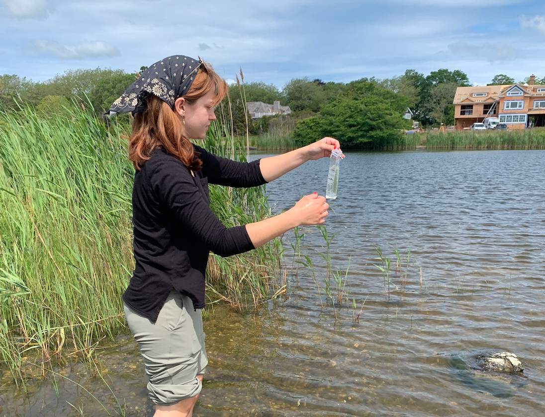 The chapter's summer intern collects a water sample in Hook Pond.