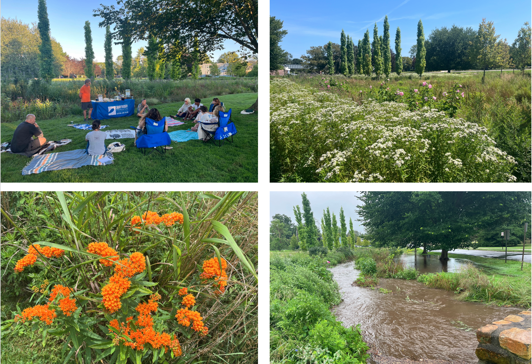 Surfrider ELI also launched its Ocean Friendly Gardens program in 2017. Their first project installed a large bioswale in the Village Green in East Hampton to help absorb the massive amounts of road runoff that flow onto the site heading downstream towards Hook Pond and eventually the Atlantic Ocean at Main Beach. What was once a monoculture lawn that regularly flooded with stormwater, has since been transformed into an oasis of native plants that quickly absorb and filter the polluted runoff. This garden is a seasonal show stopper and has great public visibility located right on the main thoroughfare heading through town.