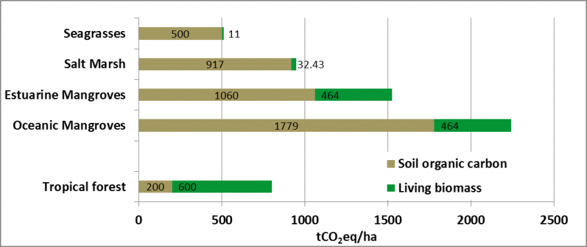 Summary of estimated carbon sequestration benefits (ton of carbon dioxide equivalent per hectare of habitat) stored in soil organic carbon (brown) and in living biomass above ground (green) in each identified ecosystem. Graphic sourced from IUCN Blue Carbon.