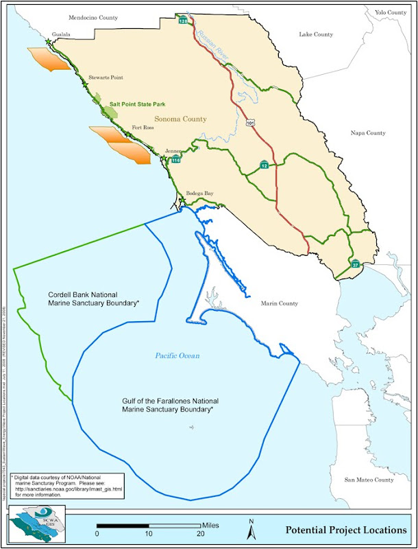 On July 7, 2009, the Federal Energy Regulatory Commission (FERC) approved three Preliminary Permits that will allow SCWA to conduct feasibility studies for a hydrokinetic energy project at three locations off the Sonoma County Coast. At this meeting, SCWA will provide a formal presentation on preliminary project information, discuss timelines and receive public input.