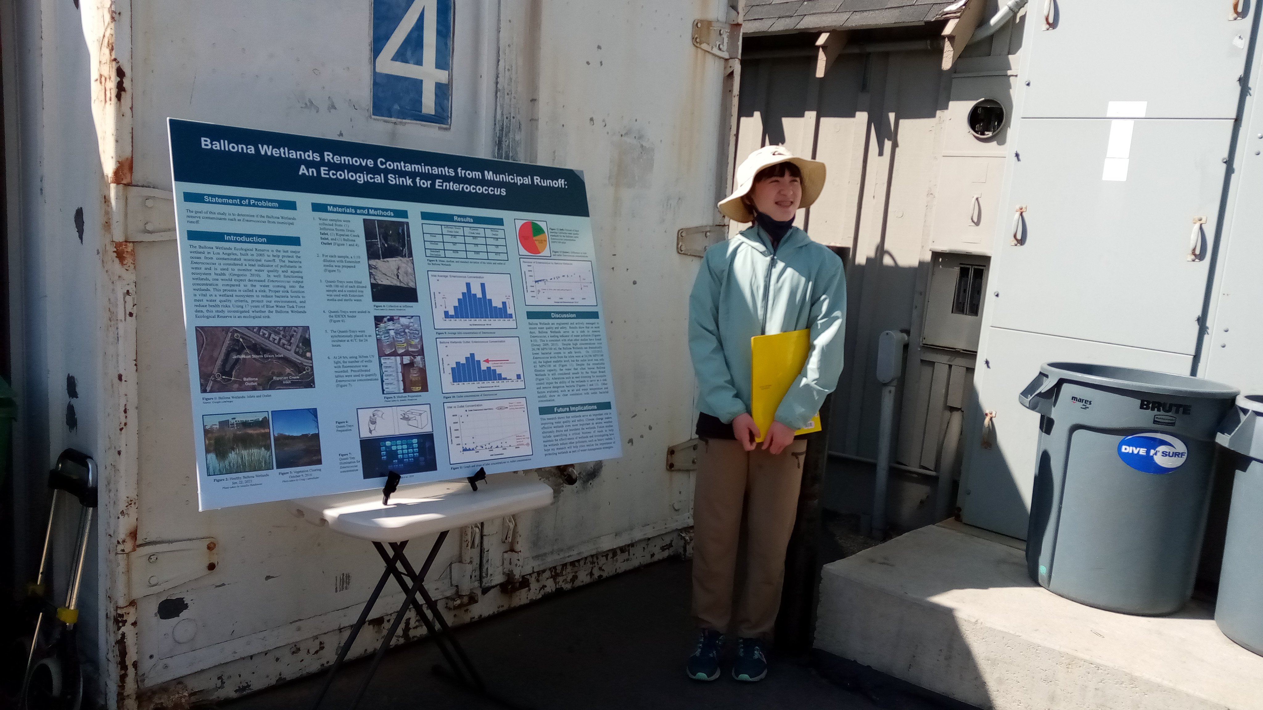 In her research, Annalia looked at past BWTF results showing fecal bacteria trends from three sampling sites that are monitored by South Bay’s BWTF program- Ballona Wetlands Marsh at Jefferson Inlet, Ballona Riparian Corridor Inlet, and Ballona Freshwater Marsh Outlet. By examining historical fecal bacteria data for these three sites, Annalia was able to observe the filtration potential of the Ballona wetlands. Her findings show that, despite high concentrations of over 24,196 MPN/100 mL of fecal bacteria enterococcus at inlet sites, the Ballona Wetlands can dramatically lower bacterial counts to safe levels once water reaches the outlet.