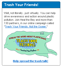 Just a Friday quickie to provide a link to Heal The Bay’s new “Trashed” website. It’s an interactive site that shows causes, effects, facts and other details about plastic pollution in the ocean. HTB wants to raise awareness about the problem and how we can help - “spread the trash talk” as they put it - and they’d love your help.