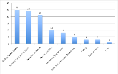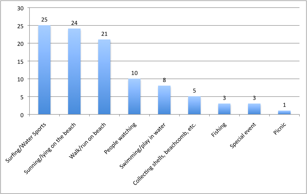 A recent study of beach attendance in the City of Solana Beach (San Diego) conducted over an entire year found that surfing was the most common primary purpose for being at the beach. See graphic above.