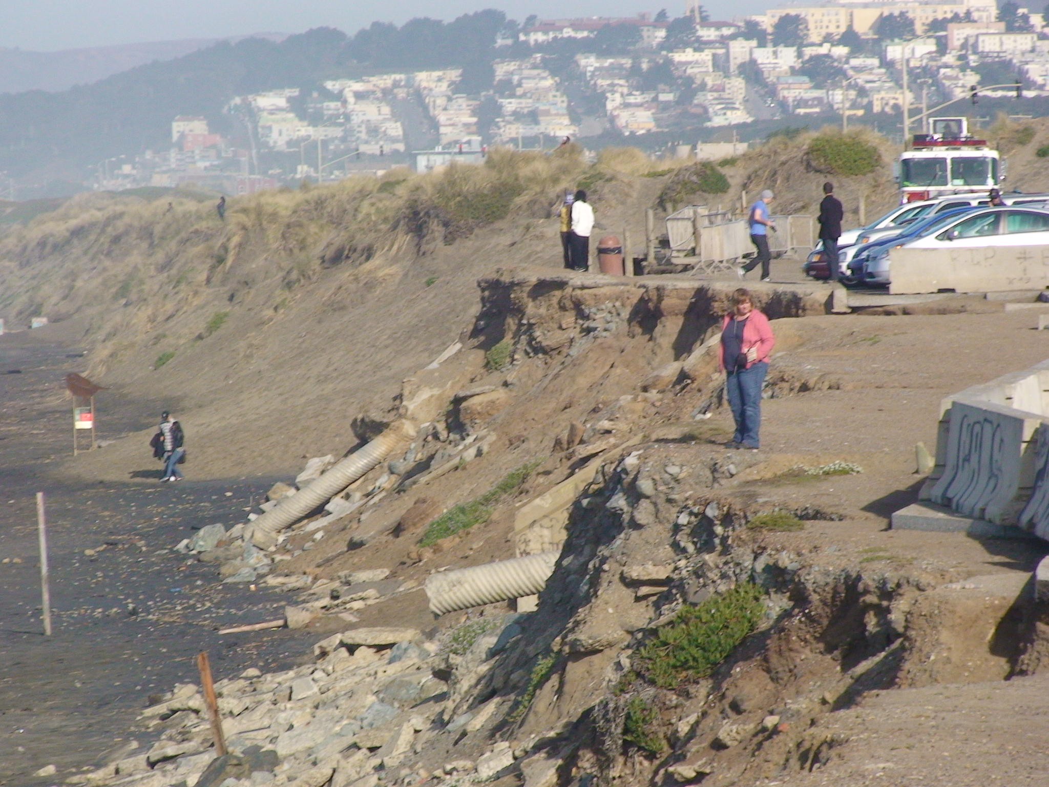 Since 2011, the San Francisco Chapter of the Surfrider Foundation has been working with public officials and the community on a proposal to restore the shoreline at Sloat. Instead of using rock as erosion control, a plan that relies on “managed retreat” is under design. Managed retreat uses relocation of threatened development to address erosion. At Sloat, the road and two public parking lots are in danger from being undermined by the surf. Under the managed retreat plan, they will be moved away from the water. Sand dunes will eventually replace the rock as the primary tool to slow erosion.