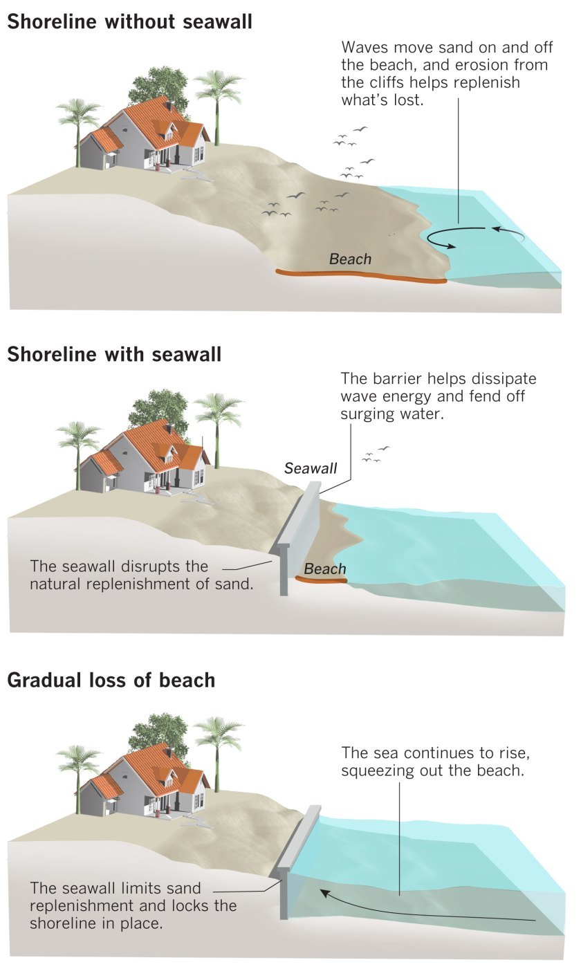 Surfrider Foundation’s beach preservation policy recognizes that beaches are a public resource and should be held in the public trust. Due to their impacts on beaches, public recreation and coastal ecosystems, sea walls and similar stabilization devices are not consistent with our mission for protection, conservation of and access to coastal resources. In areas where erosion threatens existing coastal development, the Surfrider Foundation advocates appropriate long-term solutions that maximize public benefit. Under no circumstances does the Surfrider Foundation support the installation of stabilization or sand retention structures along the coastline.