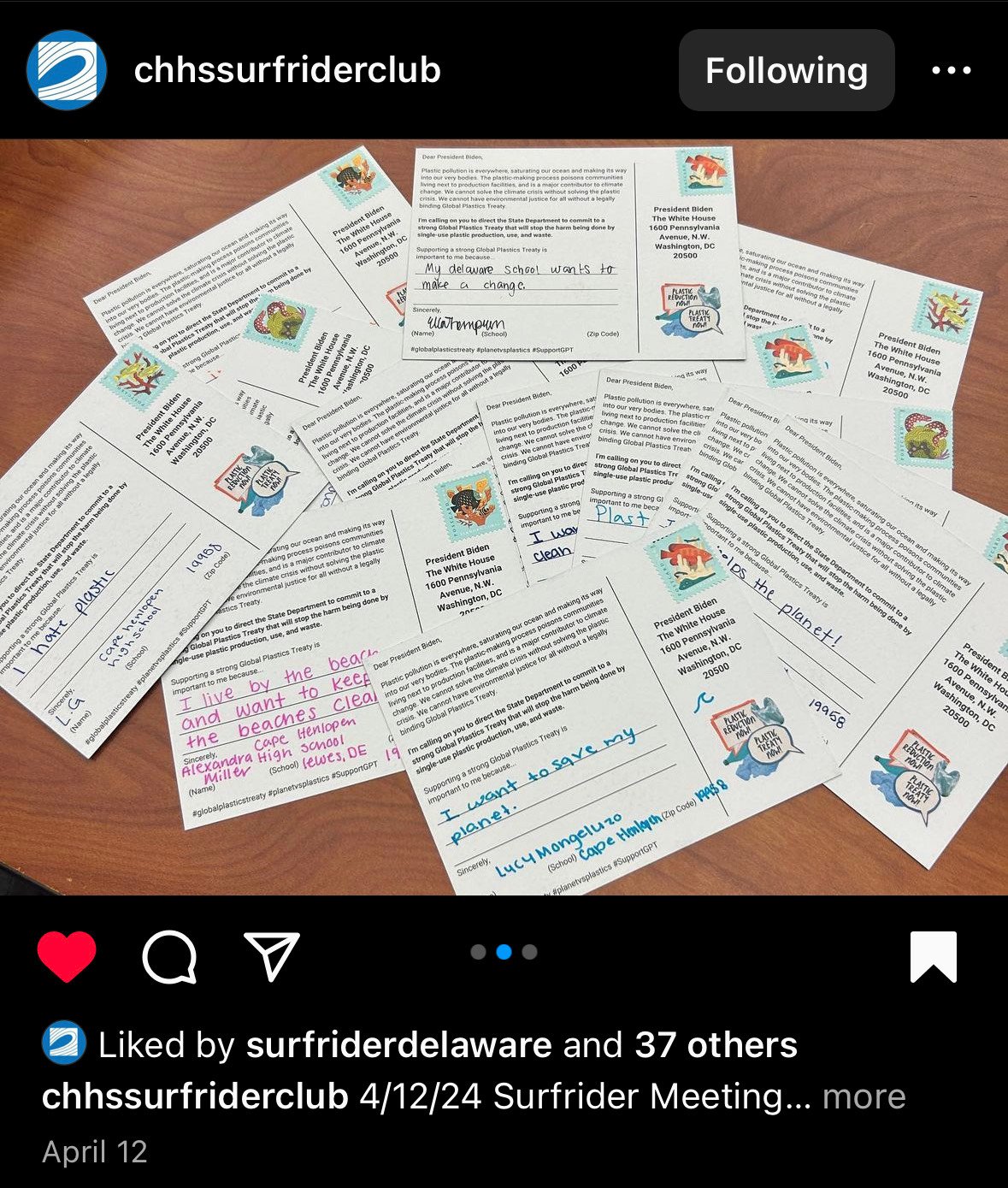 By Carolyn CurtinTo mobilize youth voices from around the United States and Puerto Rico, 54 Surfrider Student Clubs at the high school and college level have collectively mailed more than 2,000 physical postcards to the White House, calling on President Biden and the State Department to commit to a strong Global Plastics Treaty. The Global Plastics Treaty is a historic international legally binding agreement that seeks to prevent the harms done by single-use plastic production, use, and waste.