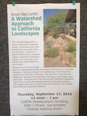 Seeing this opportunity to educate state agency staffers, APLD-CA part-time staffer, Maureen Decombe (at left) asked Surfrider's National Ocean Friendly Gardens Coordinator to give a presentation on the “watershed approach” to landscaping. (This approach is based on the same principles that OFG follows, and drops the reference to the receiving water body to both make it seem applicable to people who live inland and to appeal to our friends at River- and Bay-Friendly Gardens programs.) State agencies present included: water quality, water supply, air quality, pesticide regulation, food and agriculture, fish and wildlife, natural lands, and solid waste.