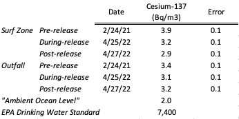 Table 1. Results of beach water radiation sampling. Cesium-137 concentration results from each sampling event are provided alongside the “ambient ocean concentration level” and EPA’s drinking water limits for comparison.