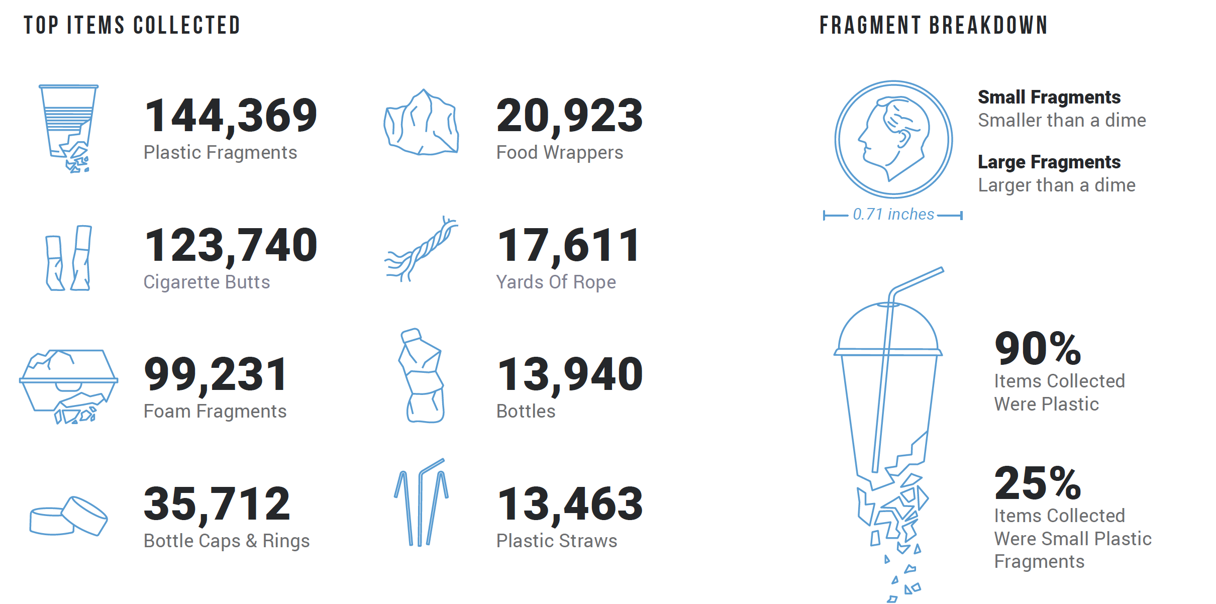 The report also dives into microplastics and the increasing threat of these tiny plastics on our planet. Microplastics, defined as plastic particles between 1 and 5mm in length, are being found in the most remote areas of the planet. These tiny pieces of plastic are even making their way into the items we consume, including our drinking water. The Beach Cleanup Report breaks down what microplastics are and how they negatively impact the environment, wildlife and people.