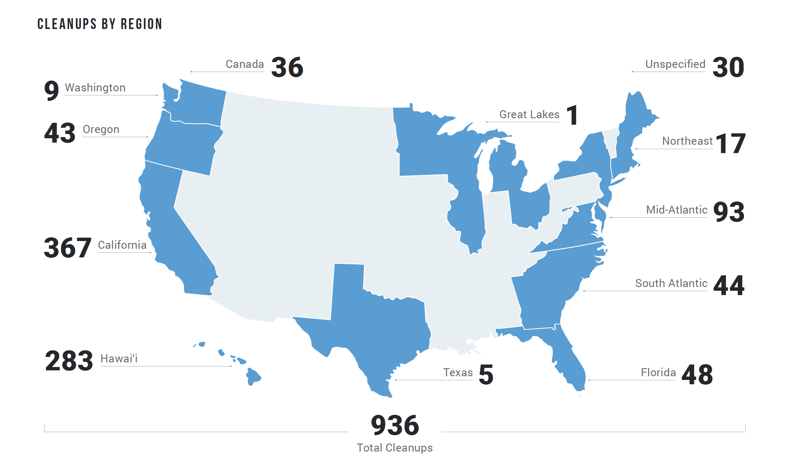 Beach cleanups play a crucial role in enabling us to learn more about the types of plastic ending up on our beaches. Our network of citizen scientists collect data during cleanups which gives Surfrider a clear picture of the state of our beaches. The 2019 Beach Cleanup Report illustrates how Surfrider has structured a system to track and account for the top littered items on the beach. We can then use this data to influence policies on a local, state and national level. During 2019, 47,059 Surfrider volunteers held 936 beach cleanups and removed nearly 300,000 pounds of trash and recycling from our beaches.