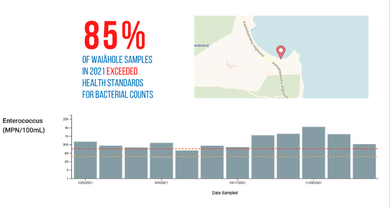 In 2021, for example, the Oʻahu BWTF collected nearly 500 water quality samples from 23 beaches. Results indicated chronic pollution in Kāne’ohe Bay, the largest sheltered body of water in the main Hawaiian Islands and an area that is significant for its cultural, recreational and scenic values. While the state is not testing this area regularly, the three BWTF sites in Kāne’ohe Bay had at least 77% of their samples exceed state health standards. Areas of Kāneʻohe Bay are also considered ‘Priority 1’ cesspool areas with known wastewater contamination. When the O’ahu Chapter released its BWTF annual report earlier this year, these data trends received significant media pickup, including three interviews of volunteers that were broadcast on the local cable news program