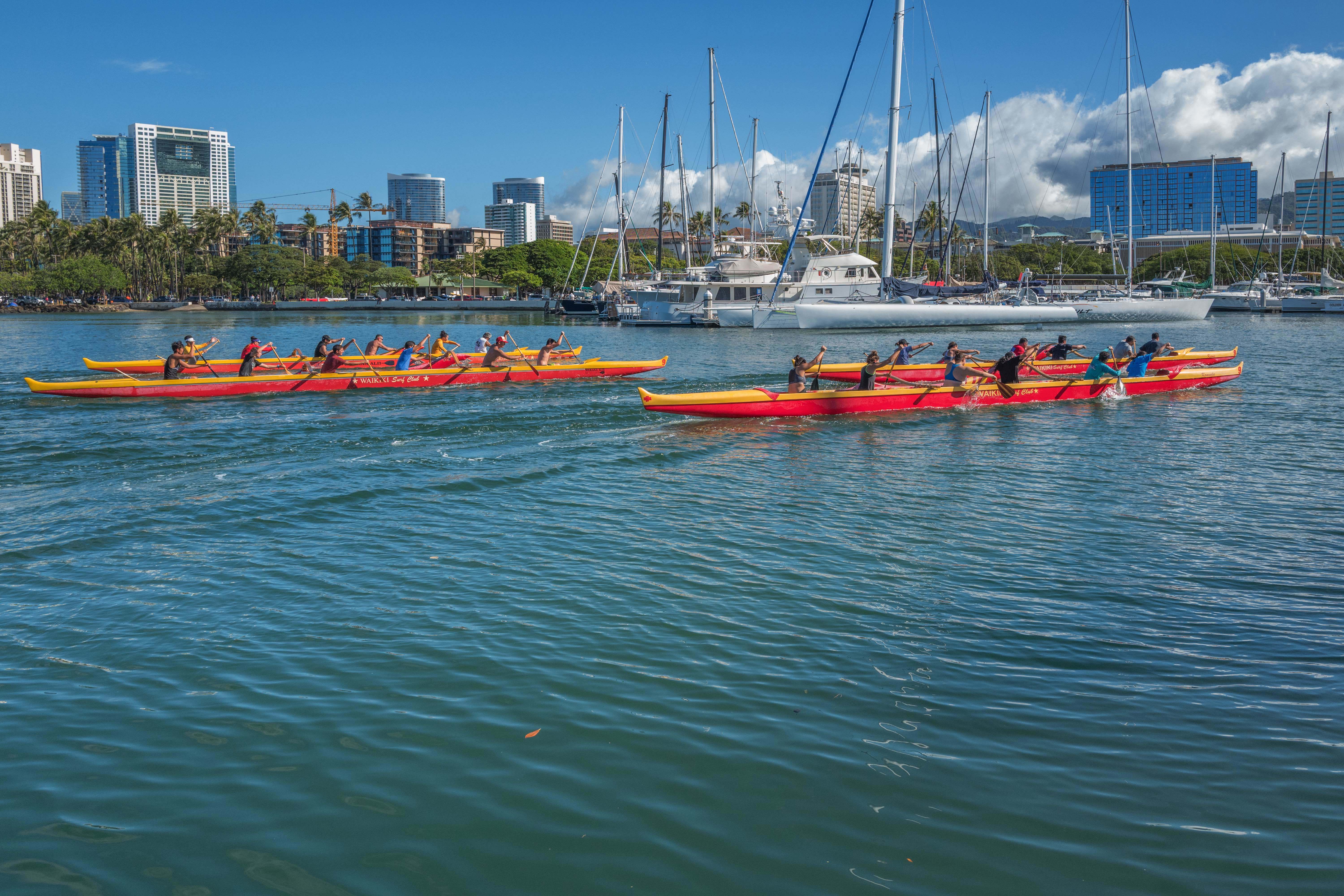 Above: Families with small children play in the calm warm waters of the Nawiliwili Stream where bacteria levels measured by the Kaua'i BWTF exceed health standards every time the stream is tested. Below: Outrigger canoes practice on the Ala Wai Canal in Waikiki which also often fails to meet health standards