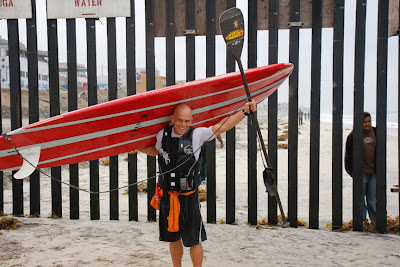 Extreme athlete Tom Jones stand-up paddled down the California coast (800+ miles thankyouverymuch) during the fall of 2007 to raise awareness to the problem of plastics pollution in our oceans. He made multiple landfalls along the way – each one punctuated by a media-friendly press conference and assorted beach & ocean-related events that local organizations planned for his appearances. The photo above is a shot of his final arrival at the US/Mexico border (yes, the fence extends into the ocean).