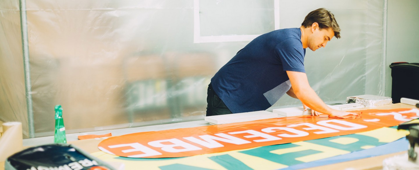 Most billboards are 14''H x 48''W, and one billboard can be the source of creating over 100 backpacks and 1,000 wallets or 10 surfbagss. Rareform sources old billboards from outdoor advertising companies such as Lamar Advertising and ClearChannel Outdoor. Once the billboards come down, Rareform picks up the vinyls to start the process in their Los Angeles, CA facility. Billboards with bright colors and typography make the best products. And they have strict cutting requirements where no logos, food, faces, etc. are used.