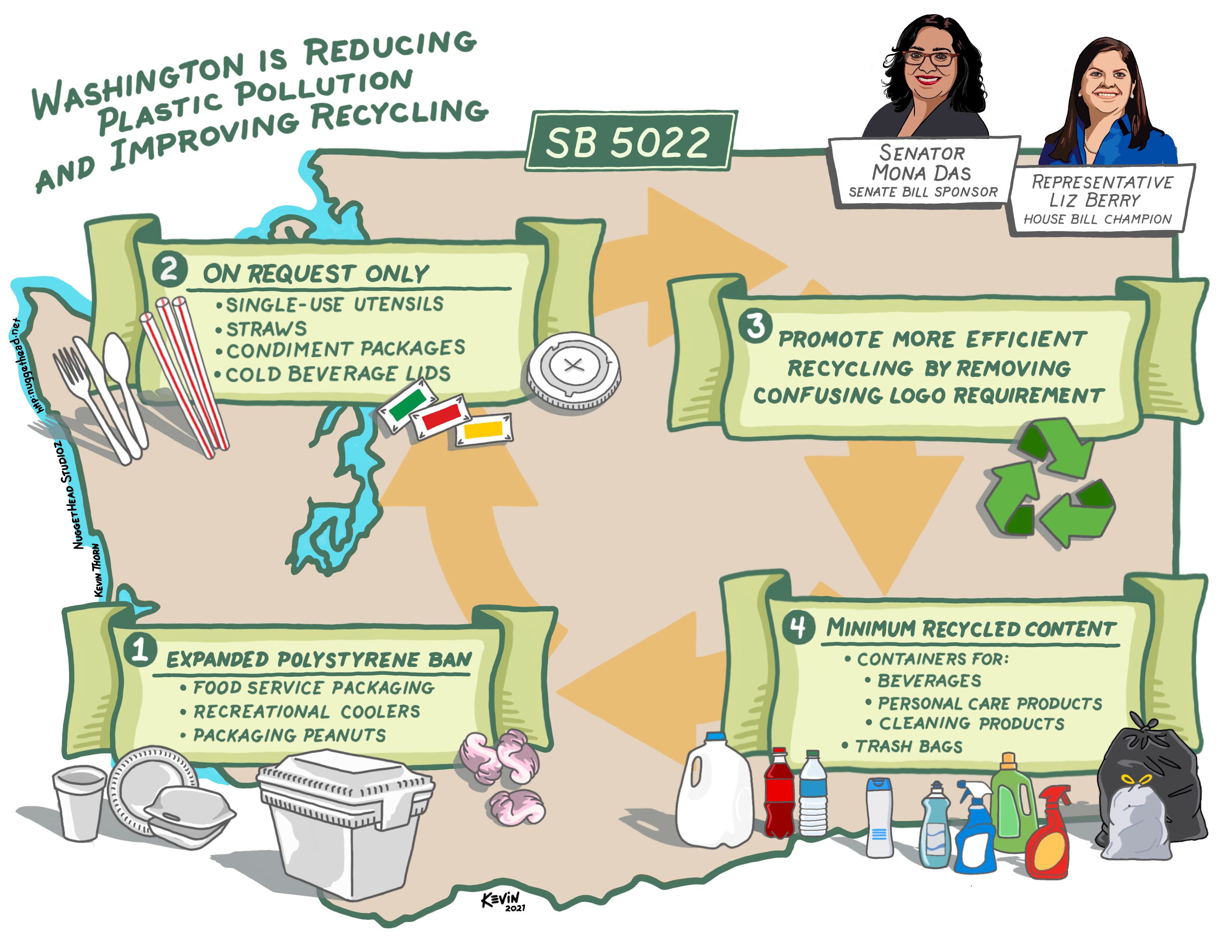 “Single-use carryout products are filling up our landfills and polluting our oceans,” said Representative Liz Berry (D-Seattle), who championed the bill in the House. “This new law encourages all of us to act together to protect Washington’s environmental future.”
