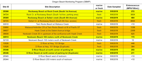 The above table shows the results from the testing performed by the Oregon Beach Monitoring Program on September 9th. All of the yellow highlighted samples exceeded the health advisory limit for recreational contact, but none of the samples indicated ‘freshwater’ had a health advisory issued, despite known contamination.